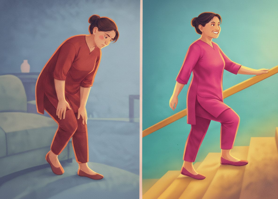 She lost 8 kilos. This was the biggest factor. Research shows that for knee joints, every kilo lost feels like losing four kilos when walking.¹ The weight reduction directly reduced the mechanical stress on her joints. She didn’t crash diet. Just ate balanced meals with more protein and vegetables, cut out processed snacks, and walked daily.